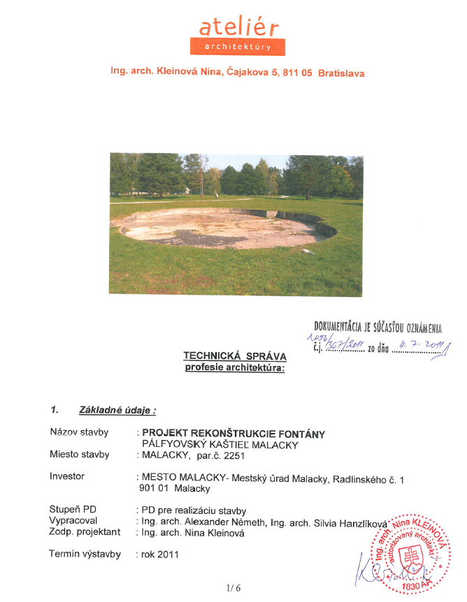 Projektovú dokumentáciu pre realizáciu stavby predložila Ing. arch. Nina Kleinová (vypracovali Malačania Ing. arch. Alexander Németh a Ing. arch. Silvia Hanzlíková).