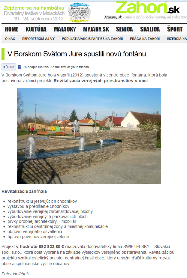 Tak to je nehorázne, za aké sumy stavajú iné obce fontány, ale asi sú v cene aj veci okolo fontány -dlažba na námestí a parkovacie plochy, ale nechápem, čo na tej malackej fontáne stálo 64 000 eur bez DPH, veď tam ešte ani podstavec na toho Tritóna do stredu fontány dodnes nespravili. Keby existovala ešte slovenská koruna, tak by taká malá fontána ako je v zámockom parku stále maximálne 500 tisíc SK, pri kvalitnom materiáli do milióna, ale nie dva milióny SK!!! Veď to robili z umelej napodobneniny kameňa a nerobili to z nejakého vzácneho talianskeho mramora, aby to toľko peňazí stálo plus nové trubkové rozvody na trisky, to je všetko. Prečo to robili z lacného umelého kameňa namiesto kvalitného pravého kameňa, ktorý vydrží desiatky rokov , keď tá firma zobrala také tisícky eur za to? To je oklamaná stavba.24.09.2012 09:34:40 | Tiez Malacan