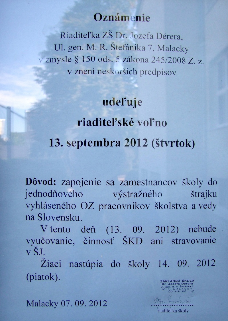 Vo štvrtok 13. septembra zostanú malacké škôlky a školy zatvorené. Pedagógovia sa stotožňujú s rozhodnutím Odborového zväzu pracovníkov školstva a vedy a budú štrajkovať. Zväz žiada posilniť štátny rozpočet SR na roky 2013 až 2015, zvýšiť mzdové ohodnotenie zamestnancov školstva už v roku 2013 minimálne o 10 % a iné. Otvorená zostane len Spojená škola sv. F. AssiskéhoŠtrajkovať budú aj škôlky