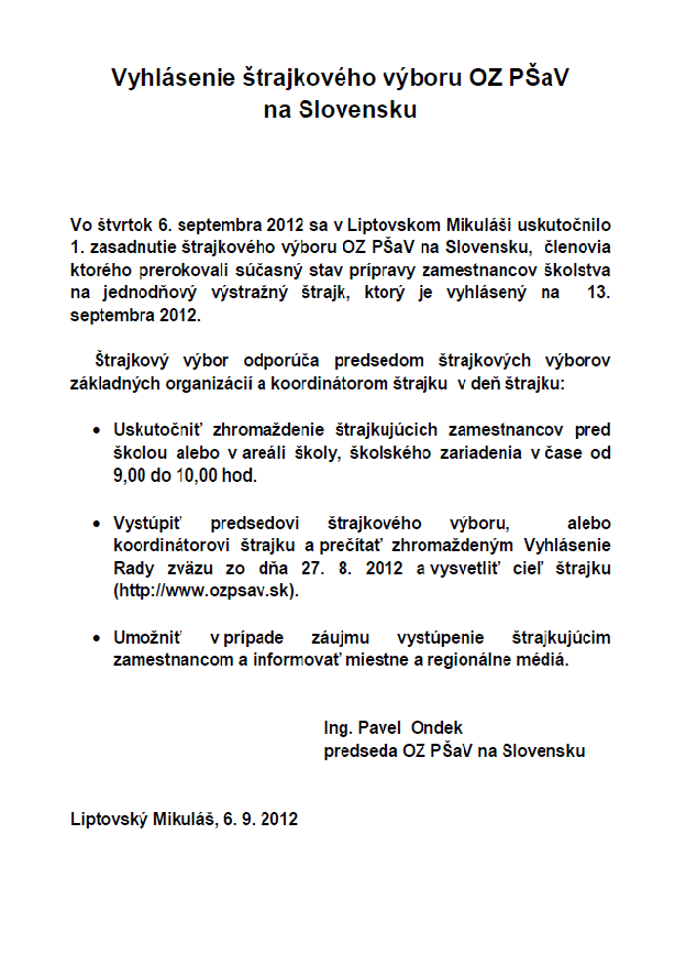 „13. 9. bude škola v štrajkovej pohotovosti. Zapojenie sa do štrajku je na individuálnom rozhodnutí učiteľov. Štrajkujúci budú mať neplatené voľno, ostatní, ktorí sa rozhodnú nezapojiť, dostanú náhradnú prácu alebo si budú môcť čerpať náhradné voľno či dovolenku,“ reagovala riaditeľka ZŠ Záhorácka PeadDr. Gabriela Emrichová. Do štrajku sa zapoja aj zvyšné mestské školy – ZŠ Dr. J. Dérera a ZŠ Štúrova. Všade bude riaditeľské voľno. „Sme skutočne podhodnotení, celkovo ide do školstva málo peňazí. S požiadavkami plne odborárov súhlasíme,“ vyjadrila sa predsedníčka ZO Odborového zväzu pri ZŠ Štúrova Mgr. Silvia Adamczaková. Štátne Gymnázium na Ul. 1. mája sa tiež štrajku aktívne zúčastní.
