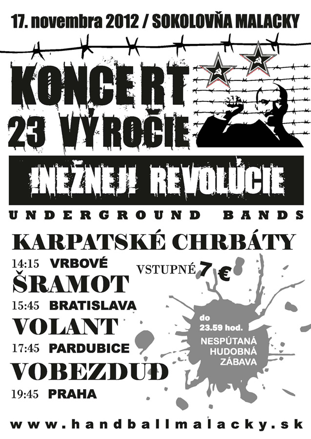 Nielen hudobný koncert, ale aj oslava výročia Nežnej revolúcie. V takomto duchu sa bude niesť podujatie, ktoré organizuje hádzanársky oddiel Strojár Malacky 17. novembra v malackej Sokolovni. Štyri hudobné telesá vyznávajúce alternatívny štýl hudby, dve z Českej republiky (Volant a Vobezdud) a dve zo Slovenska (Šramot a Karpatské chrbáty). Sami interpreti akciu v Malackách ponímajú viac ako len koncert.„Koniec totality bol významným dňom pre všetkých z nás. Bohužiaľ mám pocit, že terajší mladí ľudia strácajú záujem o tento sviatok a menej si ho vážia,“ vraví líder kapely Šramot Laco Végh.
