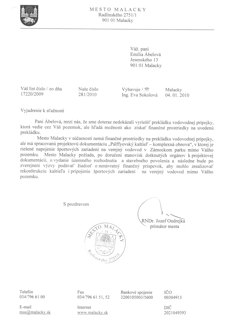 4. januára 2010 dostáva pani Ábelová vyjadrenie k jej sťažnosti od primátora mesta (zodpovednou za vybavenie teraz Eva Sokolová). Tá v odpovedi uvádza novú alternatívu riešenia. Nanovo sa začína proces prípravy projektovej dokumentácie, teraz už bez stanovenia termínu. Realizácia prípojky kaštieľa sa nakoniec realizovala z mestských peňazí, riešenie rodiny Ábelovcov, o ktorom ich informovala Eva Sokolová, nebolo aj napriek tomu realizované.
