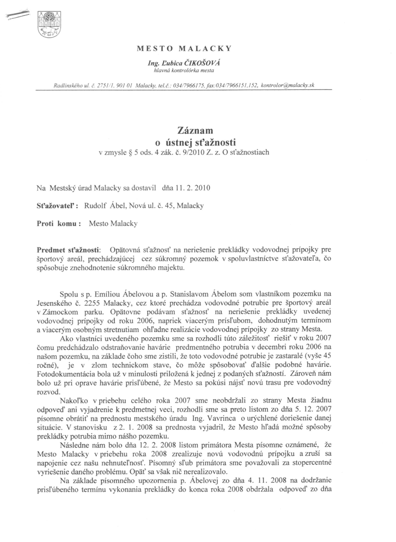Vo februári 2010 podáva už osobne pán Ábel – syn starej pani Ábelovej ústnu sťažnosť hlavnej kontrolórke mesta. Poukázal na trojročnú činnosť mestského úradu a spôsob komunikácie s nimi ako obyvateľmi mesta. Komunikáciu preberá pán Ábel, keďže stará pani Ábelová ochorela na srdce a pri akejkoľvek komunikácii s mestom sa zhoršuje jej zdravotný stav.