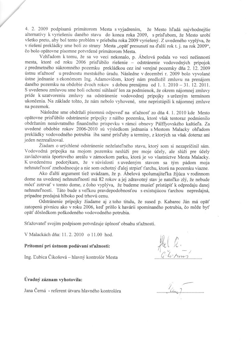 1. decembra 2009, vzhľadom na nesplnenie doterajších písomných prísľubov, prišla osobne pani Ábelová, opäť po roku čakania, podať sťažnosť na postup v prípade riešenia jej problému. Sťažnosť osobne prijal prednosta mestského úradu Dušan Vavrinec.