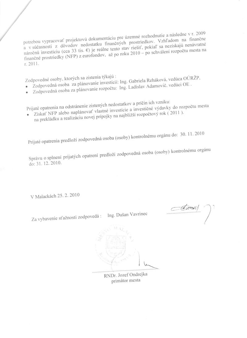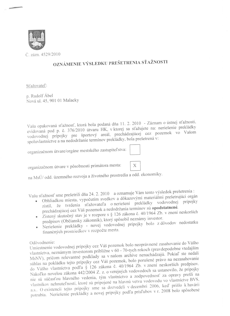 V závere mesiaca február 2010 dostáva pán Ábel odpoveď na podanú sťažnosť opäť od prednostu mestského úradu Dušana Vavrinca. V ňom konštatuje, že tvrdenia pána Ábela sú opodstatnené a zistený stav je skutočne v rozpore s Občianskym zákonníkom. Ako poslanec som z tohto prístupu zostal veľmi sklamaný. Nielenže prednosta potvrdzuje to, čo už dávno vedel, ale písomná odpoveď je podaná bez náznaku citu a pochopenia, maximálne formálne – tabuľkovo a štruktúrovane. Po vyše troch rokoch komunikácie (aj so samotným prednostom mestského úradu) som nenašiel v liste ani náznak ospravedlnenia!