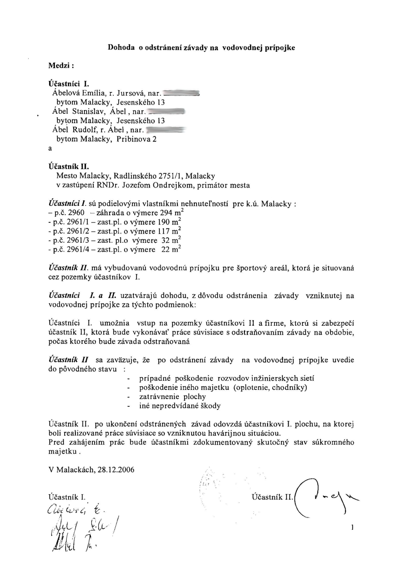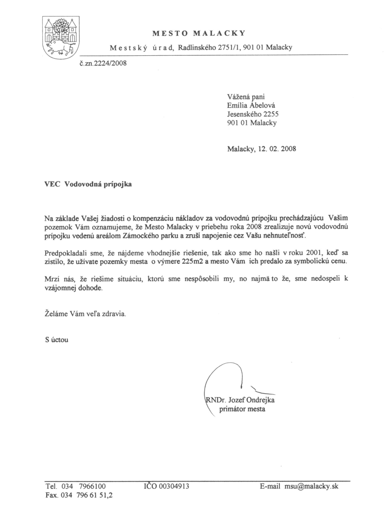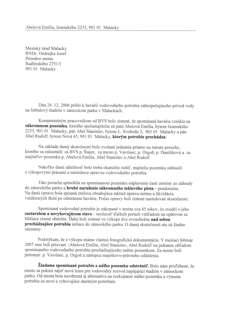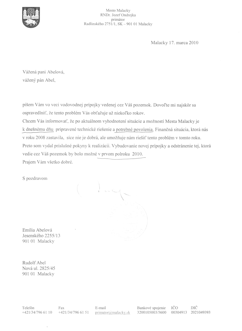Vo februári 2008 dostala pani Ábelová písomný list od primátora mesta Jozefa Ondrejku s oznámením, že „Mesto Malacky v priebehu roka 2008 zrealizuje novú vodovodnú prípojku a zruší napojenie cez jej nehnuteľnosť.“