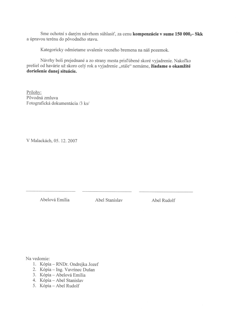Počas celého roka sa nič nedialo. Nepomohli ani osobné návštevy na mestskom úrade. Pani Ábelová teda v decembri 2007 už písomne upozornila na neriešenie situácie. V liste trvala na odstránení starého potrubia z jej pozemku.