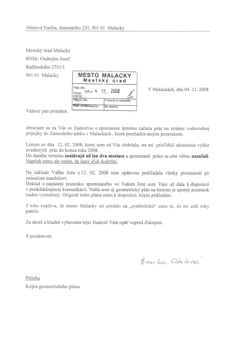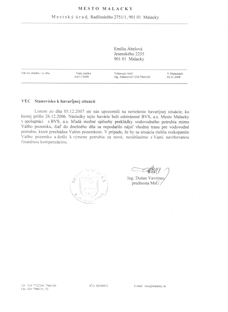 V januári 2008 zareagoval listom prednosta mestského úradu Dušan Vavrinec (zodpovedným za vybavenie Ladislav Adamovič), v ktorom oznamuje, že: „Mesto Malacky hľadá možné spôsoby prekládky vodovodného potrubia“. Zároveň konštatoval, že sa po roku nepodarilo nájsť vhodnú trasu vedenia potrubia. Osobne ma prekvapilo, že list neobsahoval informácie o ďalšom postupe, ale aj dlhé obdobie hľadania riešenia.
