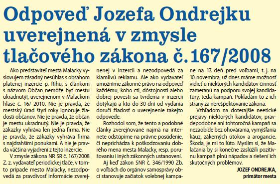 Keďže nebolo možné získať zvukový záznam z rokovania mestského zastupiteľstva, môžeme uverejniť len text reakcie primátora mesta, ktorý je zverejnený v zmysle práva na odpoveď v aktuálnom čísle Malacký hlas č. 18/2010.