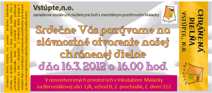 V piatok 16. 3. oficiálne otvoria v budove podnikateľského inkubátora (č. d. 312) v Malackách prvú chránenú dielňu v Malackom okrese pre ľudí aj so stredným a ťažkým stupňom mentálneho postihnutia. Zamestnanie v nej už od 1. marca našlo šesť mladých ľudí, pre ktorých je táto práca osobným naplnením. Dielňu zriadila nezisková organizácia Vstúpte."Naši klienti, ktorí navštevovali Rehabilitačné stredisko na Uici 1. mája túžili pracovať. Väčšinou zamestnávatelia nechcú ľudí s postihnutím prijímať, tak sme im vytvorili ideálny priestor na sebarealizáciu my," prezradila PeadDr. Martina Ambrušová, riaditeľka neziskovej organizácie Vstúpte.